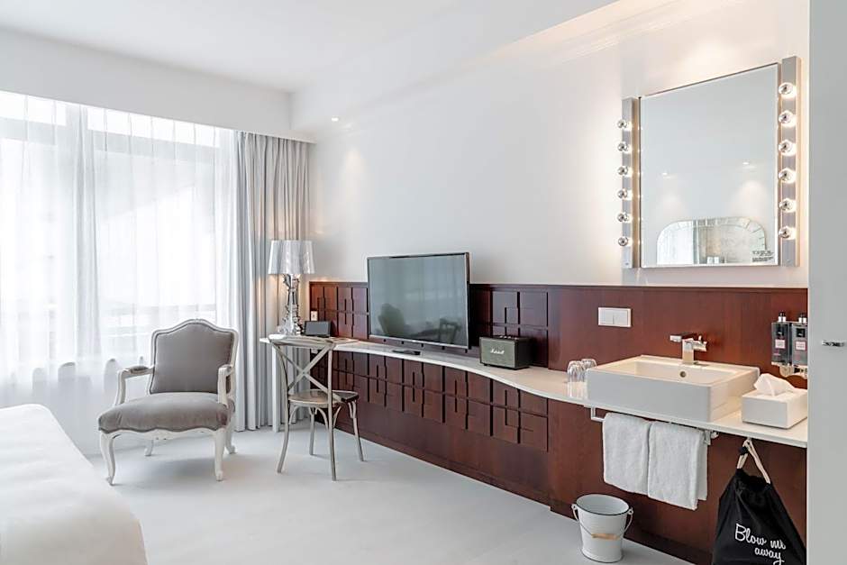 This room has a flat-screen TV and air conditioning.